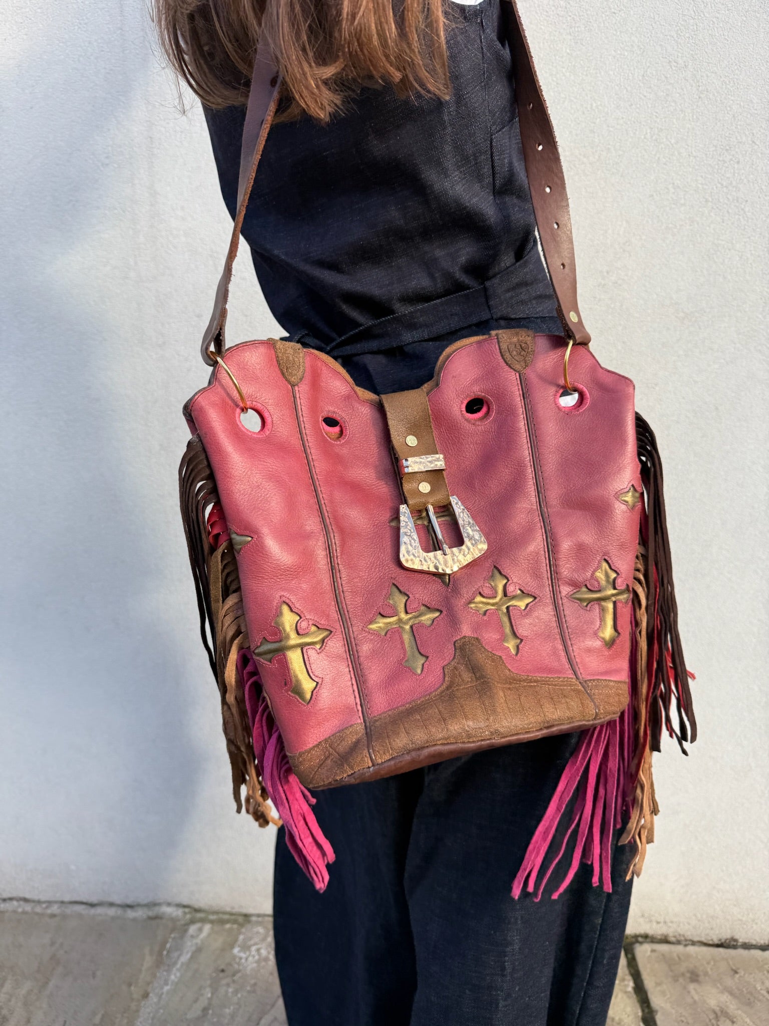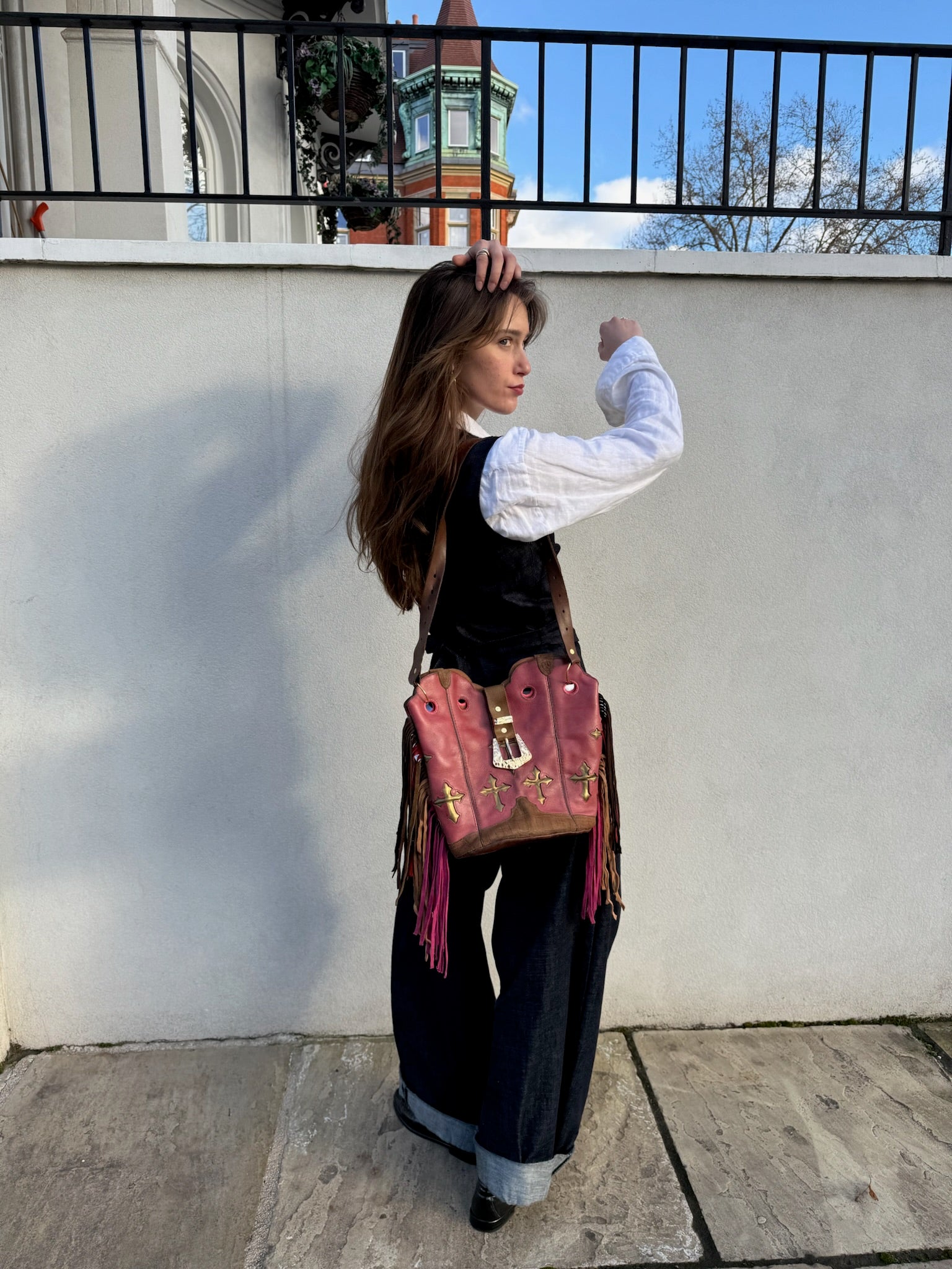 Handcrafted from 100% upcycled leather, the bags are as sustainable as they are stylish. The leather is carefully selected from damaged cowboy boots, buckles from vintage belts, giving new life to materials that would otherwise go to waste.