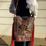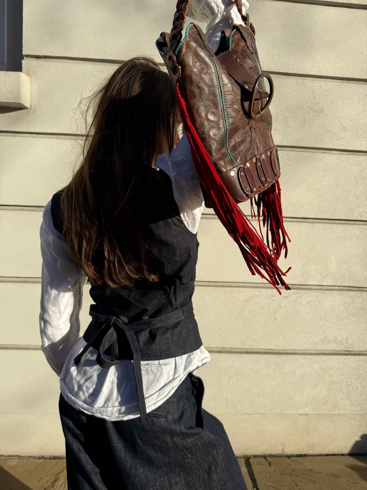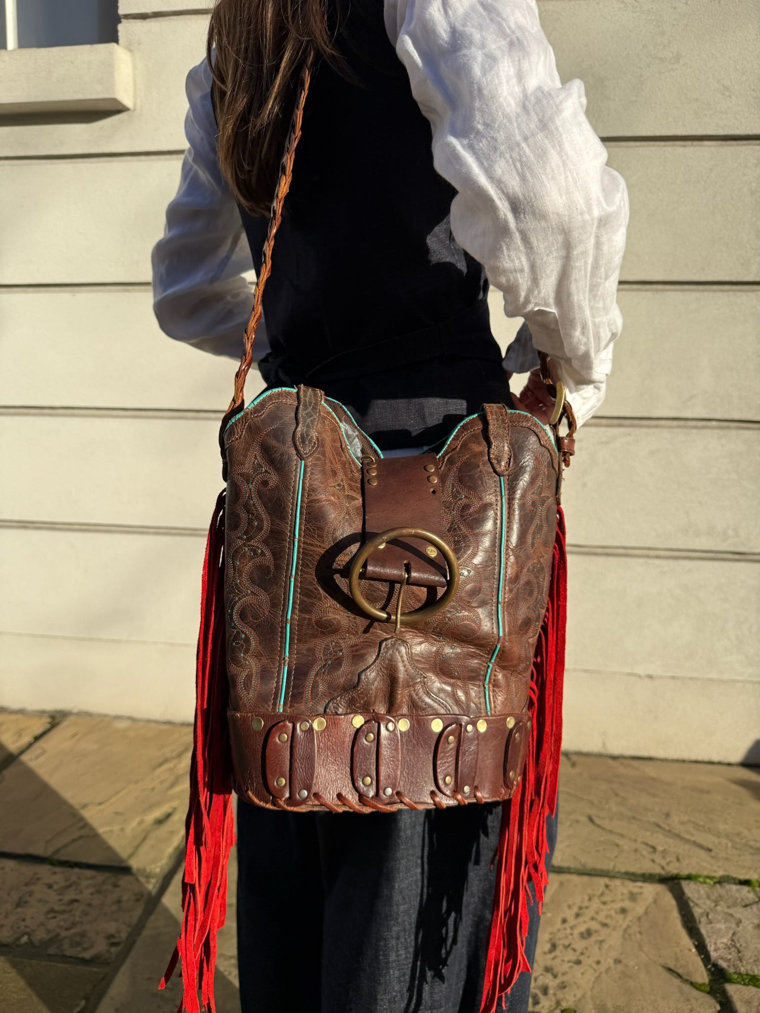 Handcrafted from 100% upcycled leather, the bags are as sustainable as they are stylish. The leather is carefully selected from damaged cowboy boots, buckles from vintage belts, giving new life to materials that would otherwise go to waste.
