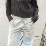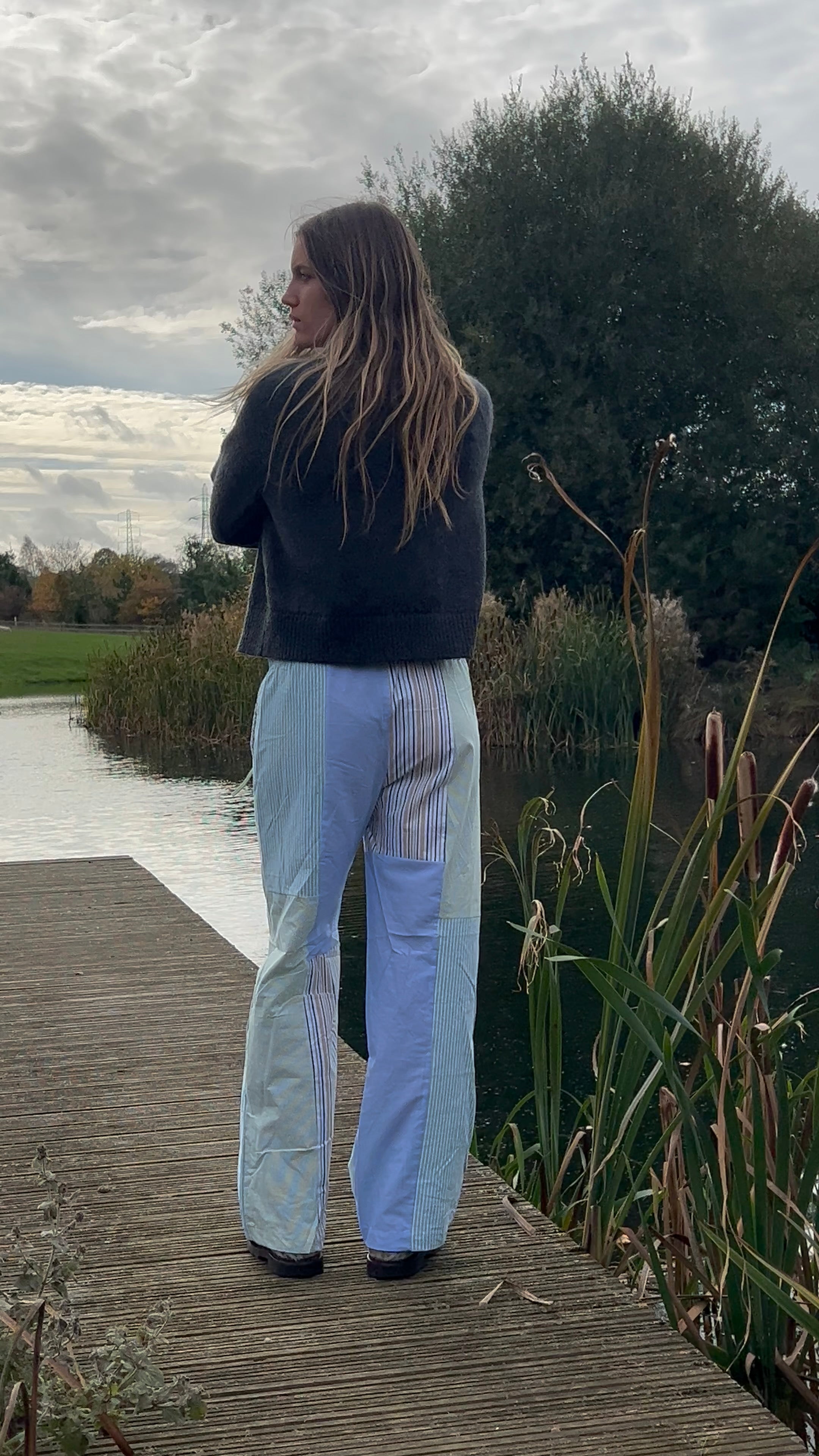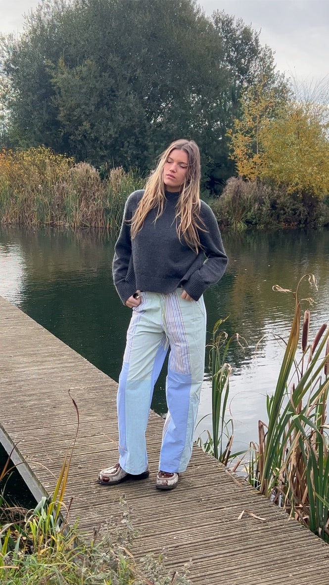 Each pair of Patcha trousers is truly one of a kind. Handcrafted from 100% upcycled cotton or linen shirts, some featuring logos, others without, no two pairs are the same.