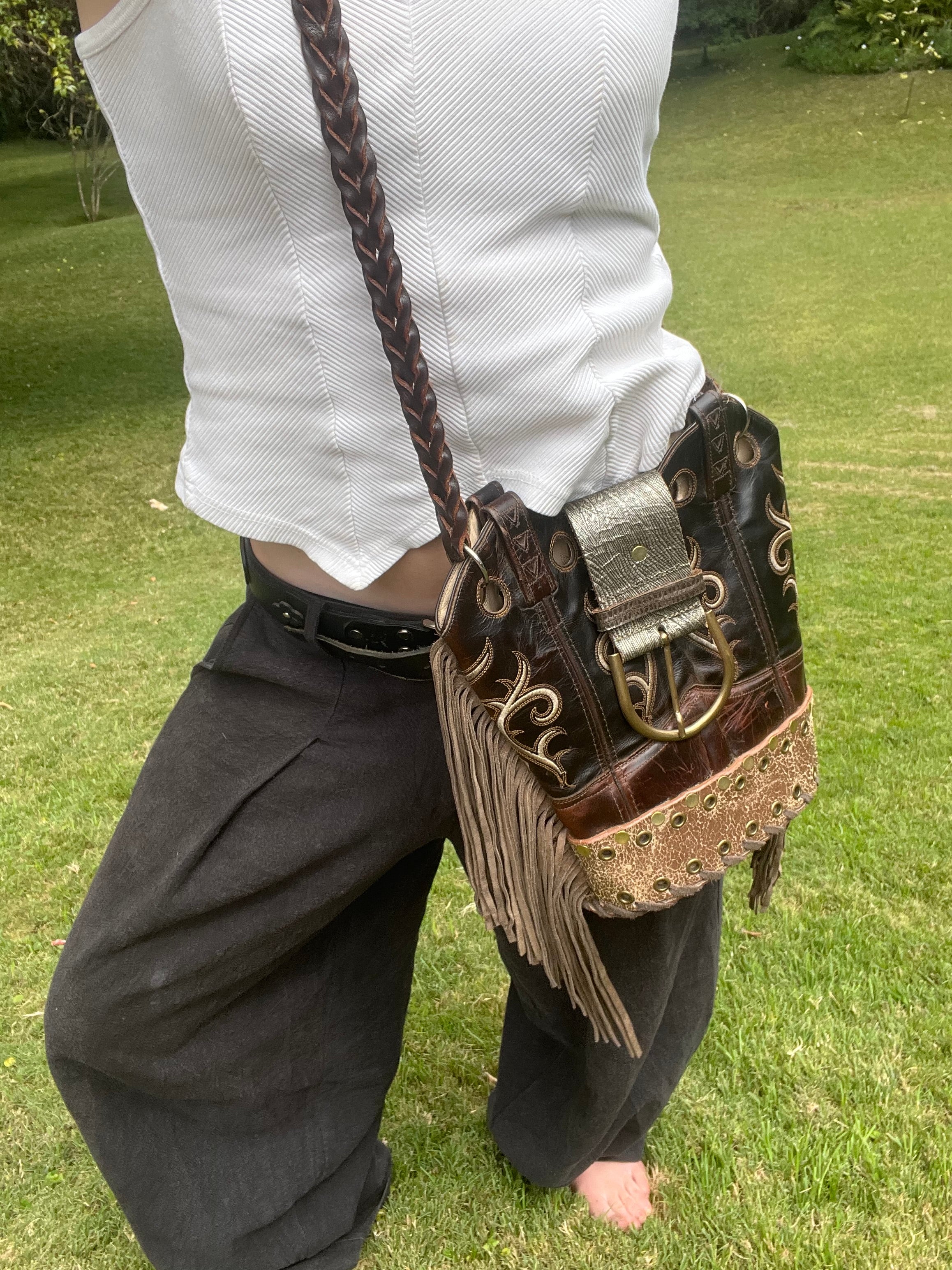 Handcrafted from 100% upcycled leather, the bags are as sustainable as they are stylish. The leather is carefully selected from damaged cowboy boots, buckles from vintage belts, giving new life to materials that would otherwise go to waste.